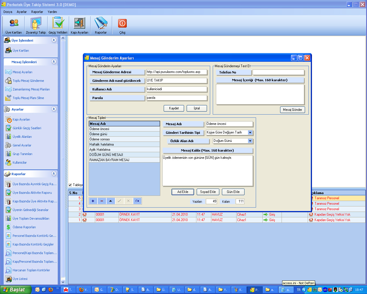 Üye Takip Sisteminde bulunan mesaj servisi; üyelere güncel mesajlar veya yazılımın içerisinde yer alan sms servisi ile önceden kaydedilmiş üye numaralarına önceden planlanan ya da anlık mesajlar gönderebilir. Mesela; bayramlarda, kandil gecelerinde veya üyelerin doğum günlerinde vb. gibi günlerde üyelere günü kutlamak amaçlı mesajlar gönderebilirsiniz. Bu üyelerin oldukça hoşuna gidecektir. Ayrıca üyelerin ilgi alanlarına uygun etkinliklerde veya kampanya ve indirimleri haber vermek için de sms servisini kullanabilirsiniz. Üyelerin ödeme günlerini de hatırlatarak ödeme yapmalarını sağlayabilirsiniz.